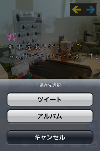 TypoBoxを起動するとコルクボード画面が現れますので、下の写真アイコンをタップして画像を選択します。写真を選んだらペンのアイコンでテキストを入力します。テキストの色を変えたい場合はパレットのアイコンを、フォントを変更したい場合はFのアイコンをクリックします。ピンチ操作で文字サイズの拡大や縮小ができますし、位置はスワイプで変更できます。Saveをクリックすると、アルバム保存かツイッター投稿が選べます。